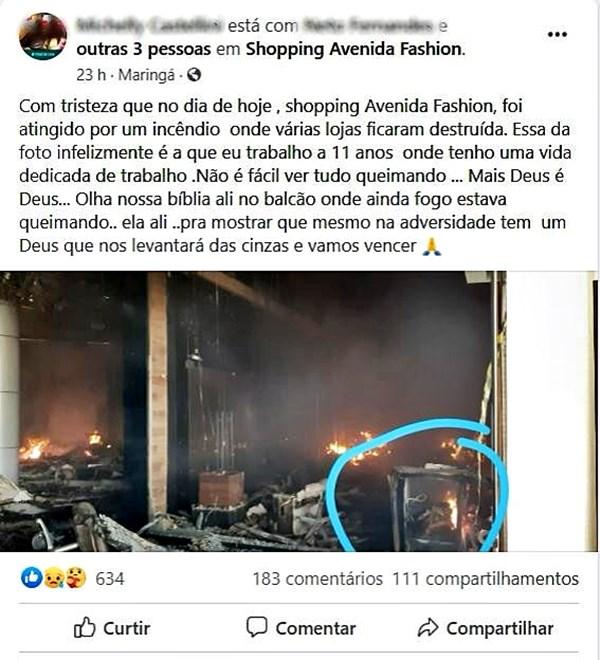 “Quem fez o post foi uma funcionária da loja Pimenta Roxa. A funcionária viu a foto, e analisou que a Bíblia que ela deixava em cima do frigobar ainda estava intacta. O shopping Avenida Fashion compartilha da fé da funcionária e reforça que Deus está sempre no comando”, diz a nota da diretoria do Shopping Avenida Fashion.